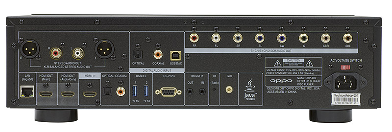 Guardiamo quindi cosa offre di diverso l’UDP-205 usando il metodo più semplice, ovvero confrontando a colpo d’occhio i pannelli posteriori (v. foto). Si nota subito che la dotazione appare simile, anche se la disposizione è stata riarrangiata. Nella sostanza abbiamo comunque le stesse uscite audio analogiche, sempre ben distinte quindi tra “nobili” stereofoniche e “semplici” multicanale, ed anche le stesse prese di in/out audio digitale (S/PDIF elettrico ed ottico, accreditate fino al PCM 192/24, ed input USB tipo B), nonché lo stesso numero di prese USB tipo A per memorie flash e dischi rigidi (due posteriori ed una frontale); le due posteriori sono però USB 3.0, molto più veloci, seppure con la stessa erogazione di corrente (1 A) delle USB 2.0 del BDP-105.