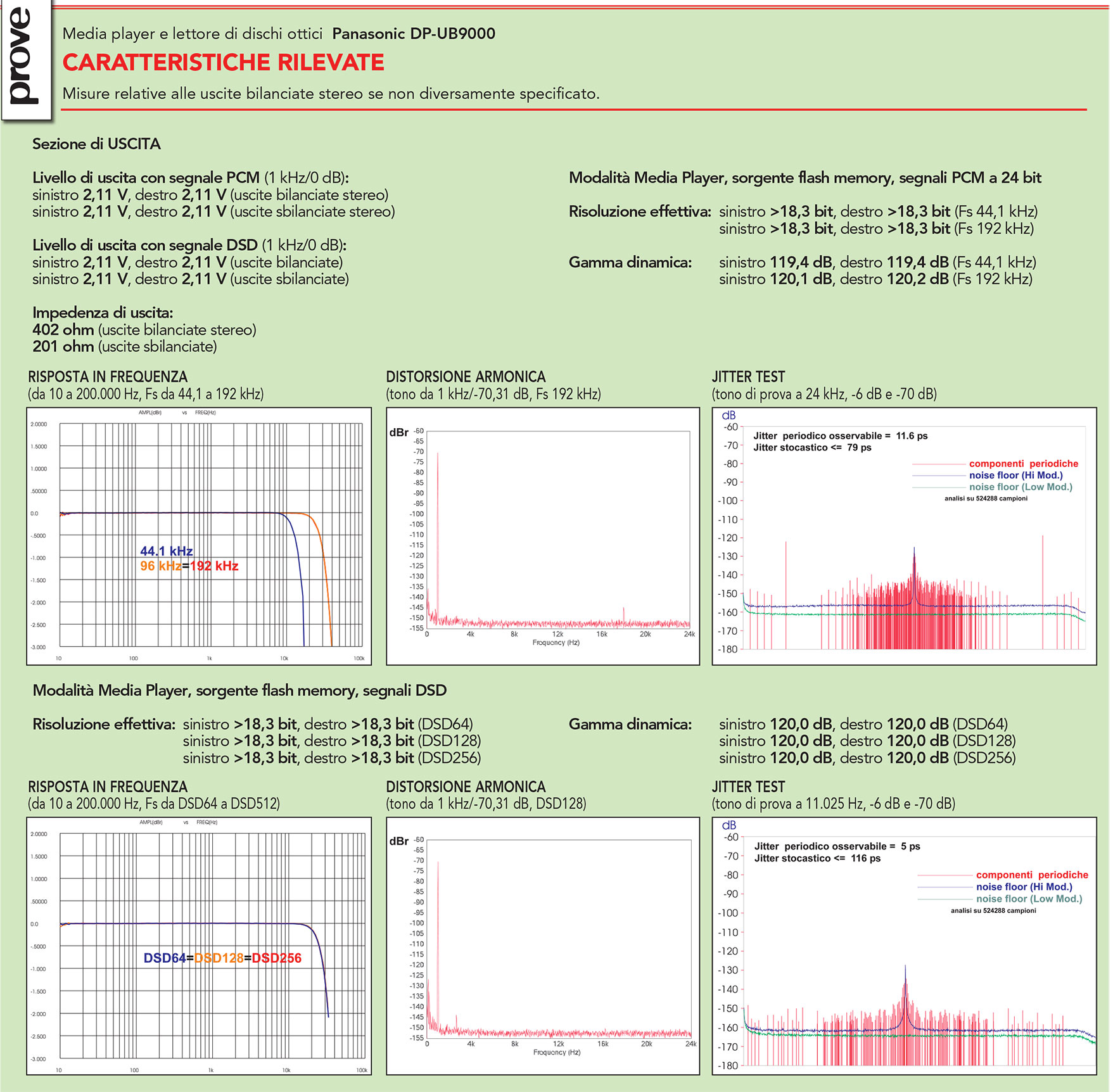 Il player Panasonic è risultato compatibile con segnali DSD fino a 4X (DSD256) e in PCM fino a 384 kHz di frequenza di campionamento, ma per taluni aspetti il comportamento è apparso quello caratteristico dei sample di preserie in cui le prestazioni non sono state ancora ottimizzate o messe a punto, il che ha sconsigliato di effettuare test estesi e completi come quelli che tipicamente effettuiamo su questi componenti. Quelli emersi dai test sono peraltro dati di rilievo.
