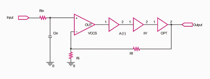 In questa immagine, ripresa dal sito del costruttore, il diagramma del circuito di amplificazione “Current Mode”, che utilizza il negative feedback per garantire stabilità al sistema.