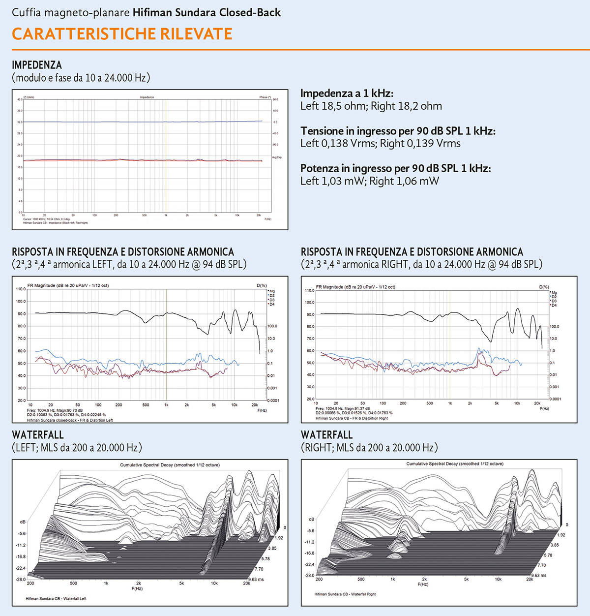 La risposta in frequenza della Hifiman Sundara Closed-Back rilevata al banco su testa artificiale parte in maniera molto regolare mostrando una buona estensione nelle prime ottave per poi evidenziare qualche incertezza nella gamma da 200 a 1.000 Hz, che potrebbe caratterizzare la sua interpretazione della gamma media. Il resto della risposta prosegue in maniera conforme alle attese, anche se con qualche variazione in più in gamma altissima rispetto alla versione aperta. La distorsione è contenuta come sono contenute le risonanze evidenziate dai grafici della waterfall. La risonanza attorno a 7 kHz decade molto rapidamente ed è tipica di questa tipologia di trasduttori. Il grafico dell’impedenza è quasi rettilineo e mostra un valore che non dovrebbe mettere in difficoltà alcun Digital Audio Player oggi in commercio, garantendo al contempo un buon livello di emissione. Il valore di sensibilità misurato è buono anche se si assesta su valori decisamente inferiori rispetto a quanto dichiarato dal costruttore.