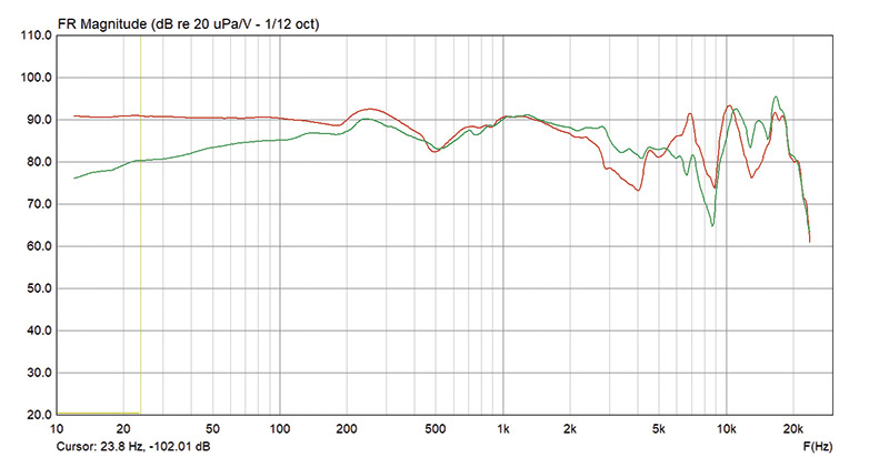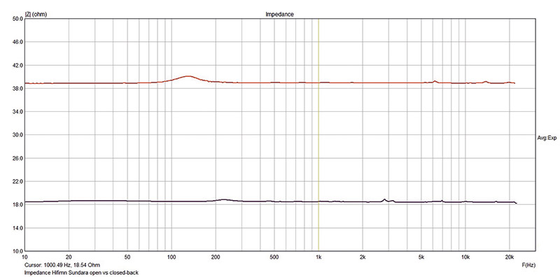 La Figura 1 mostra il confronto della misura della risposta in frequenza su testa artificiale e su “testa reale”, misura effettuata nella seconda condizione con dei minuscoli microfoni intraurali Sound Professional. È facile vedere come in gamma bassa la pressione sonora sia inferiore, cosa che abbiamo potuto anche riprodurre sulla testa artificiale inserendo una matita tra questa e il cuscinetto; da qui la raccomandazione di porre attenzione nell’indossare la cuffia e di non trascurare l’ipotesi di rivolgersi al mercato after-sales per un eventuale acquisto di cuscinetti ancora più morbidi e sigillanti di quelli già morbidi forniti di serie. Infine, faccio notare l’ultima attenzione posta dal progettista verso colui che abbia optato per una cuffia magneto-planare chiusa, notoriamente grande mangiatrice di watt e di conseguenza con sensibilità ridotte. Nella Figura 2 troviamo il confronto fra le impedenze misurate sui due tipi di Sundara, aperta e chiusa; ebbene, la versione chiusa ha un valore di impedenza pari a 20 ohm in meno rispetto a quella aperta. Gli amplificatori che la piloteranno, se in grado di lavorare bene su quei valori, potranno erogare quindi più watt a parità di tensione di uscita.