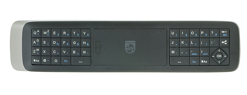 Sul lato opposto del telecomando c’è una utile tastiera completa che facilita molto la digitazione degli indirizzi dei siti Internet. Sotto il marchio si trova la vaschetta delle batterie.