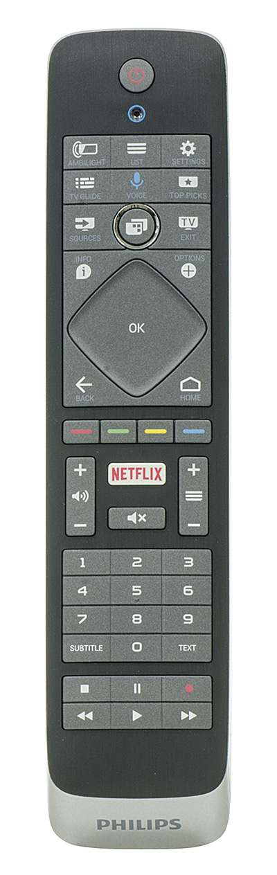 Il televisore è provvisto del sistema Ambilight su tre lati, che in funzione delle immagini visualizzate sullo schermo, dell’audio e secondo le impostazioni e le preferenze dell’utente crea un’illuminazione colorata attorno al TV per incrementare la sensazione di coinvolgimento, secondo le intenzioni dei progettisti. Il telecomando, aggiornato all’occorrenza con la funzionalità di swipe sulla superficie del cursore, è dotato di microfono per la ricerca vocale, di un tasto per richiamare l’app di Netflix e di una completa tastiera QWERTY sul lato opposto.