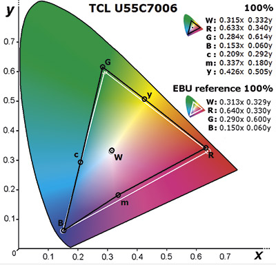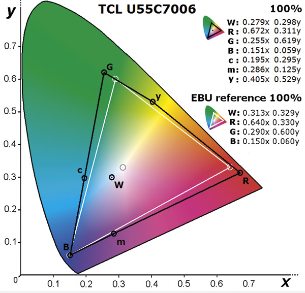 In modalità Rec 709 il gamut è leggermente inscritto nel riferimento. In HDR il gamut rilevato si amplia ed il punto del rosso concede un buon guadagno, anche se complessivamente risulta meno esteso di altri TV e presenta una forma non regolare, legata alla posizione del punto del verde.