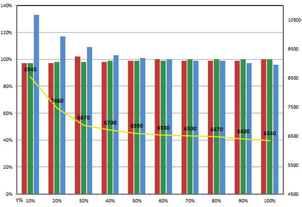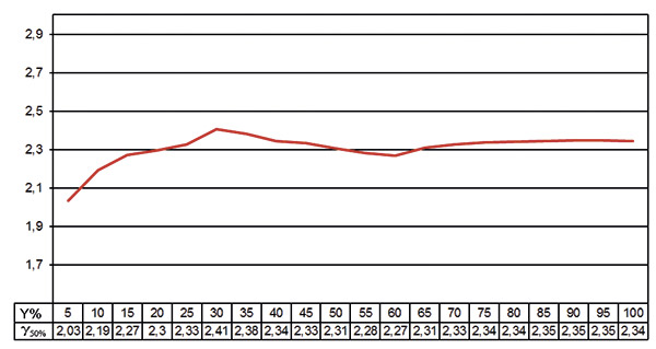 Il gamma, normalizzato al valore rilevato al 50%, è sempre ben aderente al riferimento.