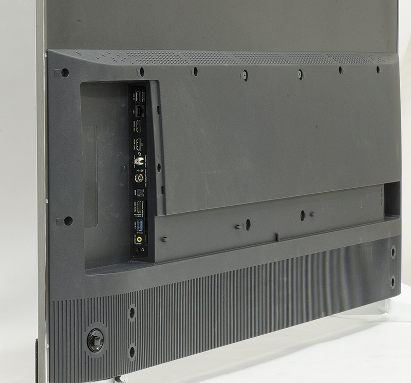 Le connessioni sono raccolte in un vano coperto da una protezione in plastica e consistono in 3 ingressi HDMI e un videocomposito. A questi si aggiunge una porta USB 3, la presa di rete, una uscita digitale ottica e lo slot CI.