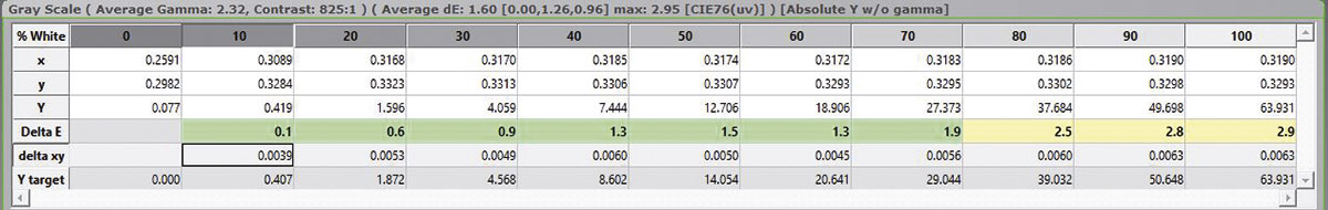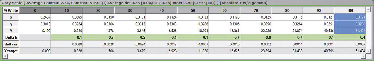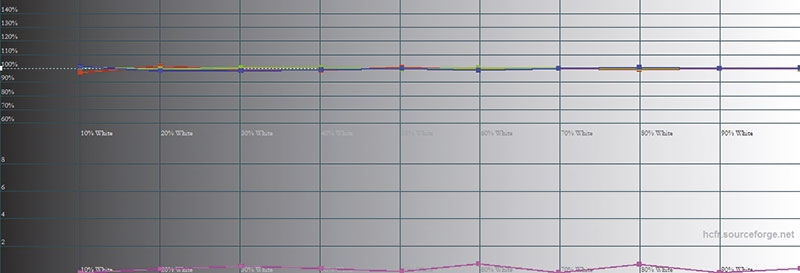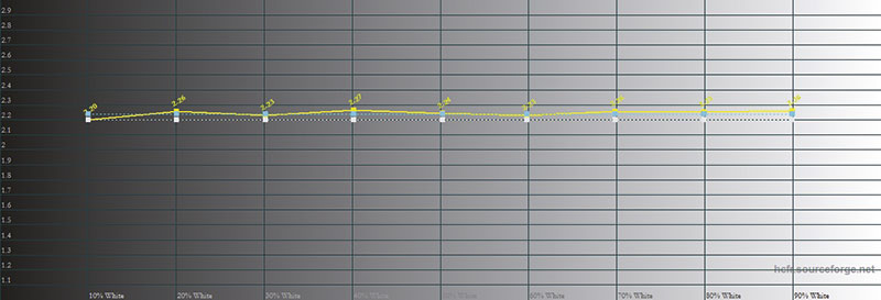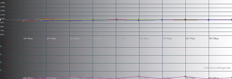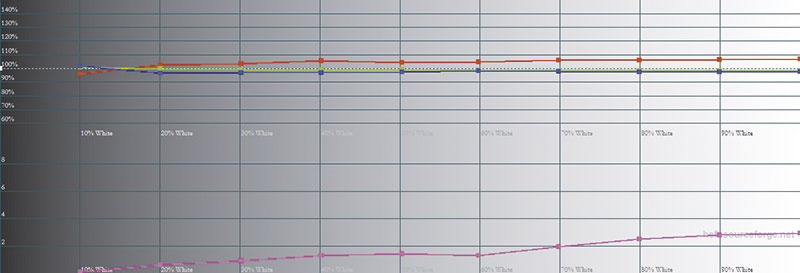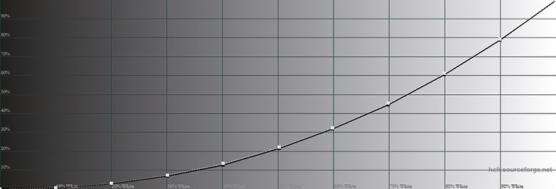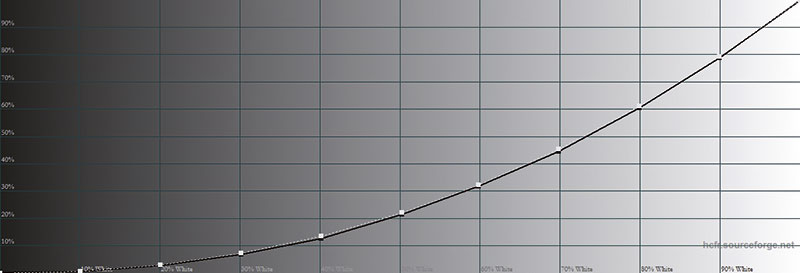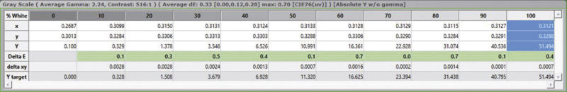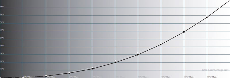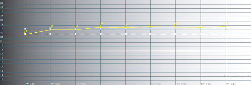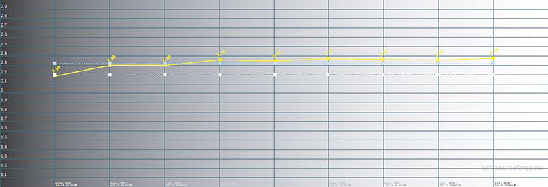 Già dalla tabella dei valori misurati si nota il piccolo scostamento dalle coordinate del D65, in generale di lieve entità e comunque contenuto entro il 2.9 misurato al 100%, cosa che dice di una calibrazione tutto sommato corretta anche se non numericamente precisa al capello. I grafici confermano questa conclusione, a cominciare da quello della luminosità decisamente vicino al riferimento e dalla successiva curva del gamma abbastanza piatta e vicina al 2.2.