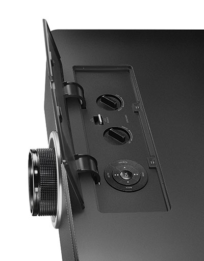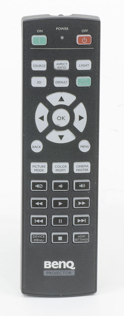 Il fianco destro permette l’accesso al vano della lampada accreditata per una durata di 2.500 ore in modalità normale, ovvero 3.500 in economico e 6.000 in save mode, mentre il sinistro contiene il filtro dell’aria che periodicamente deve essere pulito o sostituito. I sensori del ricevitore di telecomandi sono due, posizionati frontalmente e sul retro così da garantire la vista ottica con il trasmettitore in qualsiasi condizione di installazione; il trasmettitore è di formato contenuto, come si conviene ad un proiettore dato che una volta effettuate le regolazioni nell’uso quotidiano sono sufficienti i pulsanti per la selezione della sorgente e del profilo di visione, è robusto e si impugna comodamente e, dulcis in fundo, è dotato di illuminazione. Una caratteristica essenziale dato che il proiettore viene tipicamente utilizzato in ambiente oscurato.